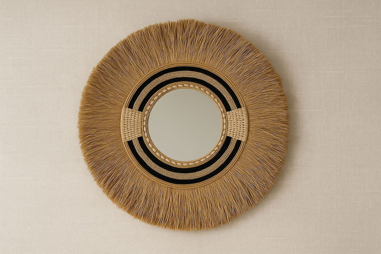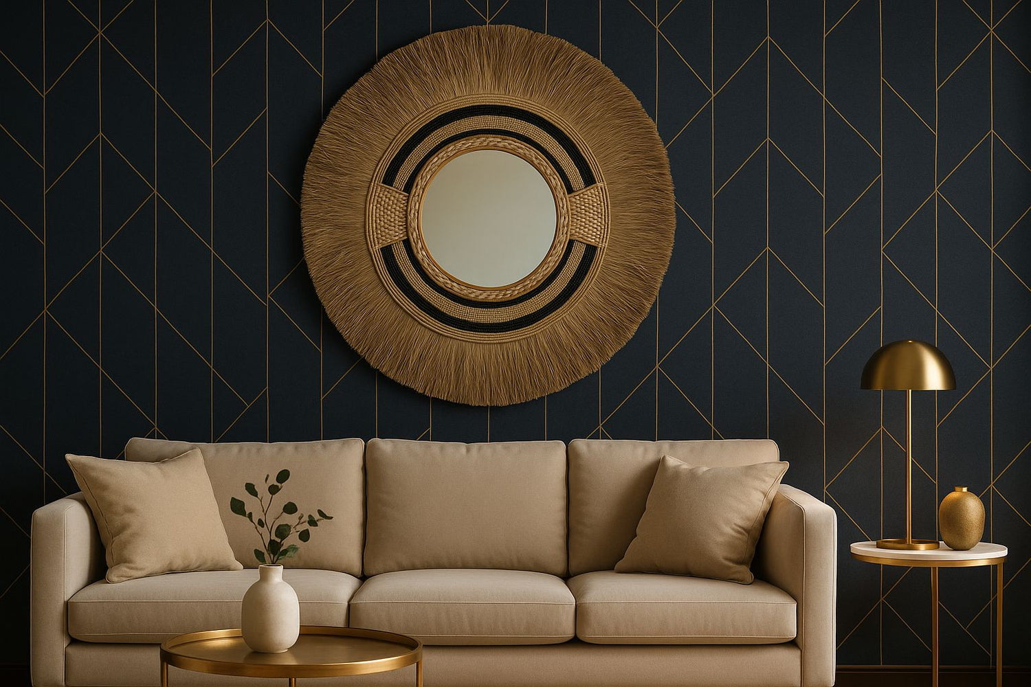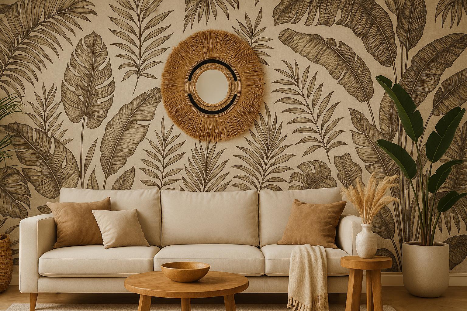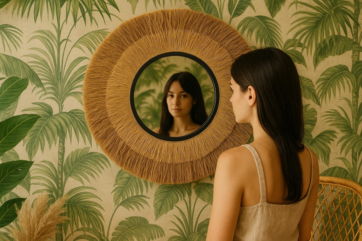 Een Bali spiegel met raffia of rotan past prachtig bij een behang met natuurlijke prints, zoals tropische bladeren of zachte zandtinten. Bij druk behang kies je beter voor een rustige, ronde spiegel die balans brengt in de ruimte.