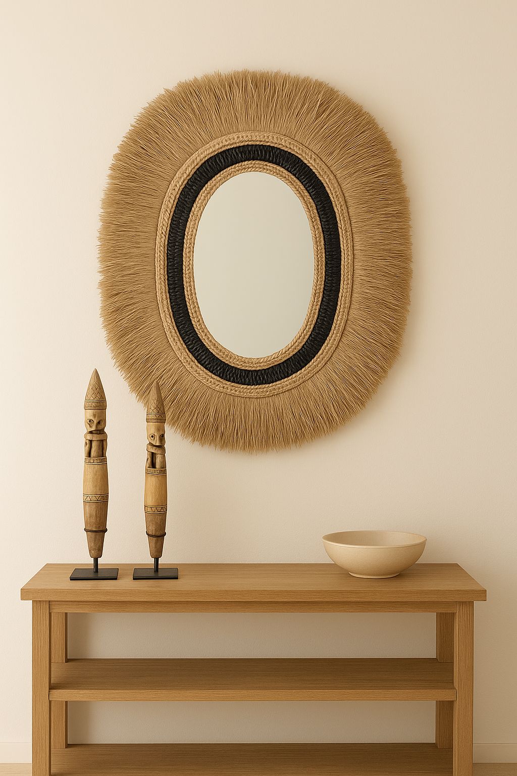Pair your mirror with a beautiful handmade figurine for that extra touch of ambiance. This creates a harmonious whole that will brighten not only your wall but the entire room. Each figurine is unique and brings the same tropical charm as our mirrors, giving your interior an even stronger Bali vibe .