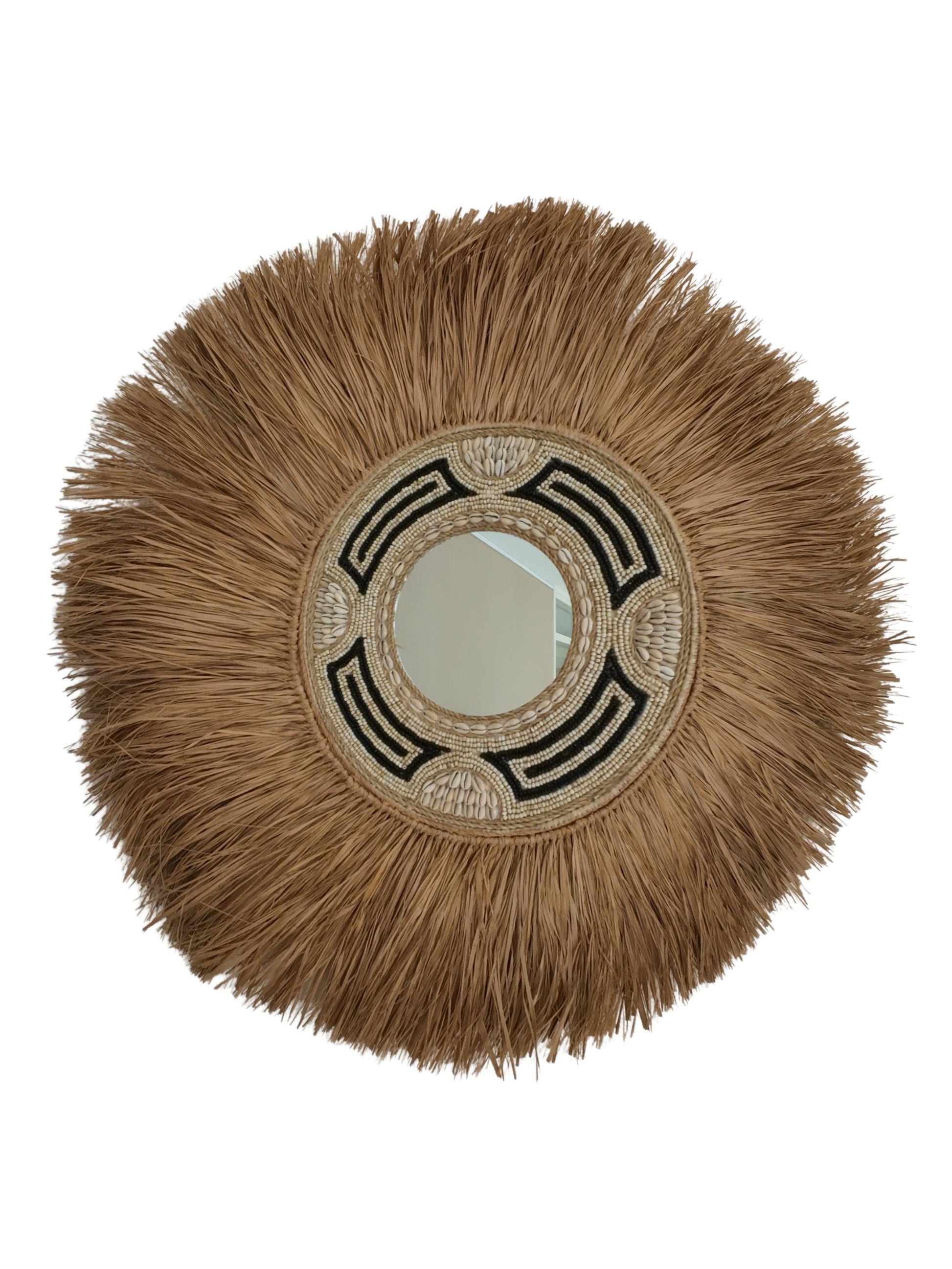 Bring the soul of Indonesia into your home with the Java Soul Mirror . This unique wall mirror is entirely handmade in Indonesia with natural raffia and delicate shell details. The design exudes the tropical atmosphere of Bali and combines perfectly with a bohemian or Ibizan interior.