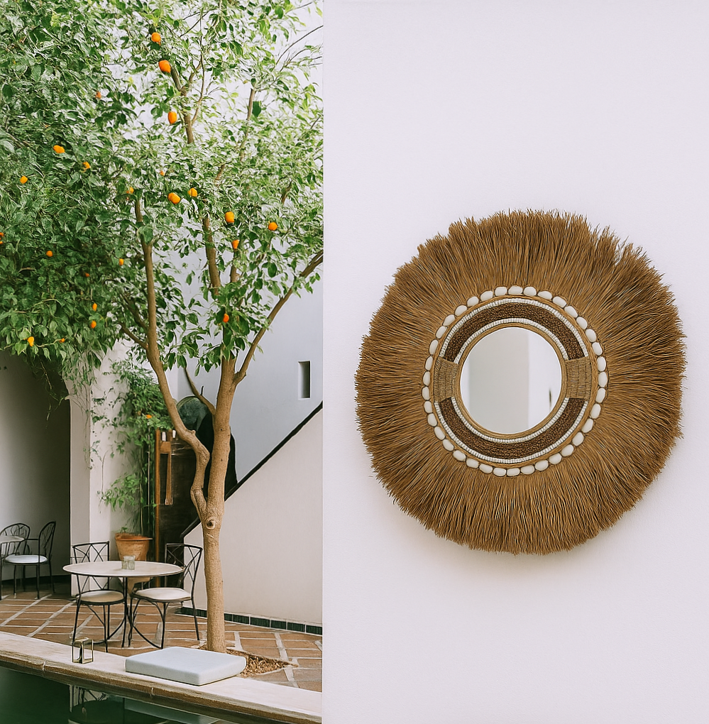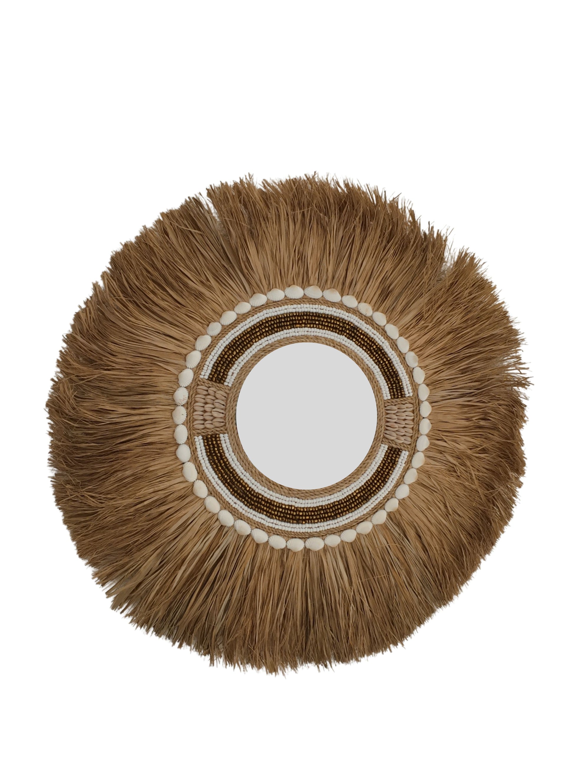 Bring a tropical island vibe to your interior with the Lamu Mirror . This handmade wall mirror combines natural raffia with delicate shell and beaded details, making it a true eye-catcher in any room. The design exudes both tranquility and luxury and is perfect for a bohemian, coastal, or cosmopolitan interior.
