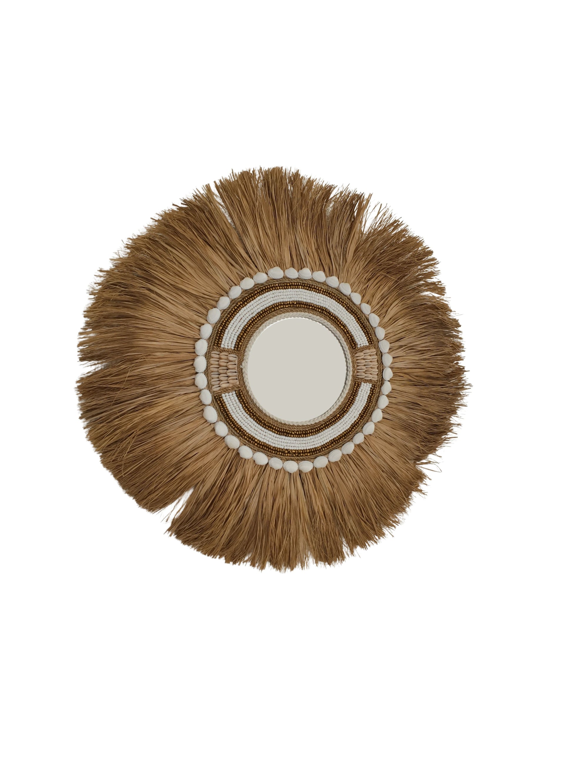 De Luzia is een prachtige Bali- en Ibiza-stijl spiegel die direct warmte en charme toevoegt aan je interieur. Met de hand vervaardigd van natuurlijk zeegras, schelpjes en kralen straalt deze ronde spiegel de ultieme boho chic vibes uit. Het zonvormige ontwerp maakt hem tot een stralend middelpunt in elke ruimte – of je hem nu in de woonkamer, slaapkamer of hal hangt. Een unieke eyecatcher die niet alleen jouw reflectie weerkaatst, maar ook jouw liefde voor natuurlijke elegantie en exotische luxe.