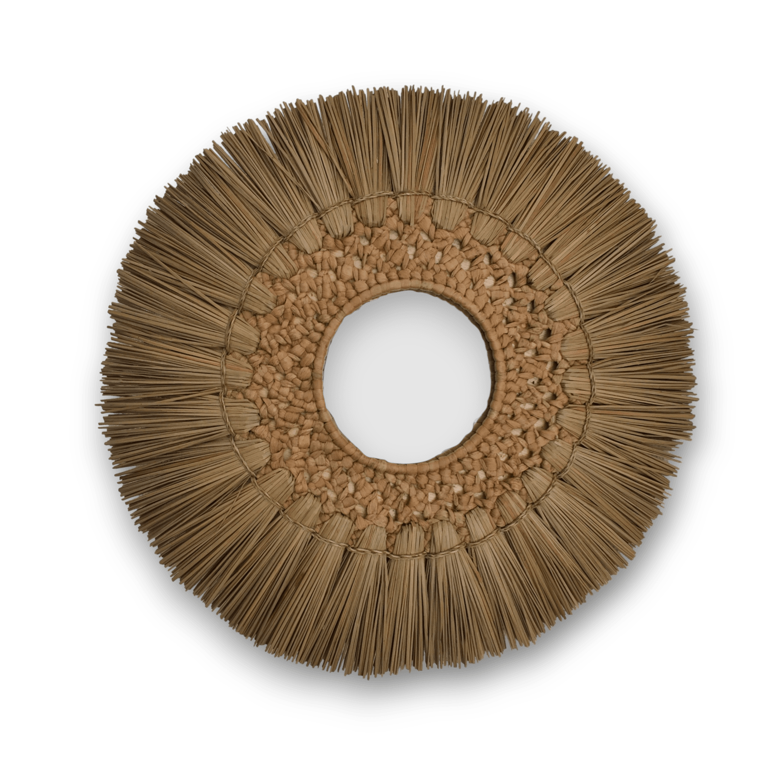 Creëer een stijlvolle en exotische sfeer in huis met de Spiegel Makoa. Deze ronde wandspiegel combineert de natuurlijke charme van gevlochten raffia met een opvallende rand van grasvezels, waardoor hij een echte blikvanger is in elk interieur.