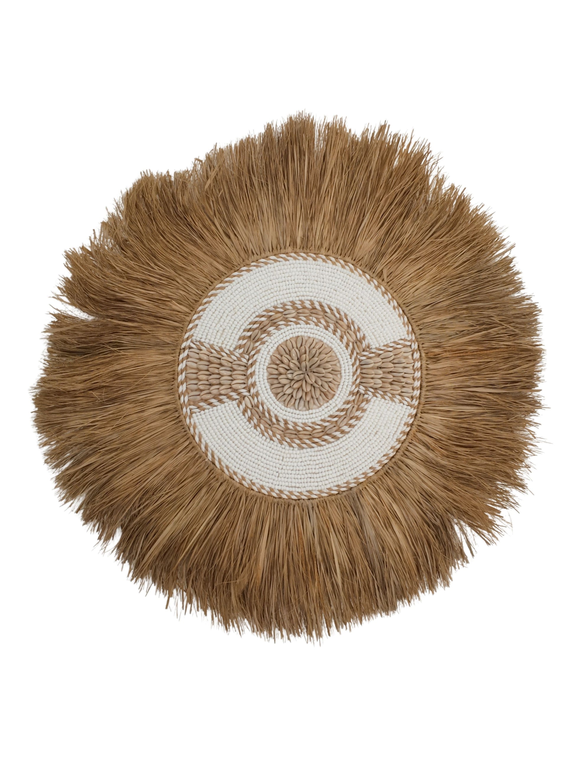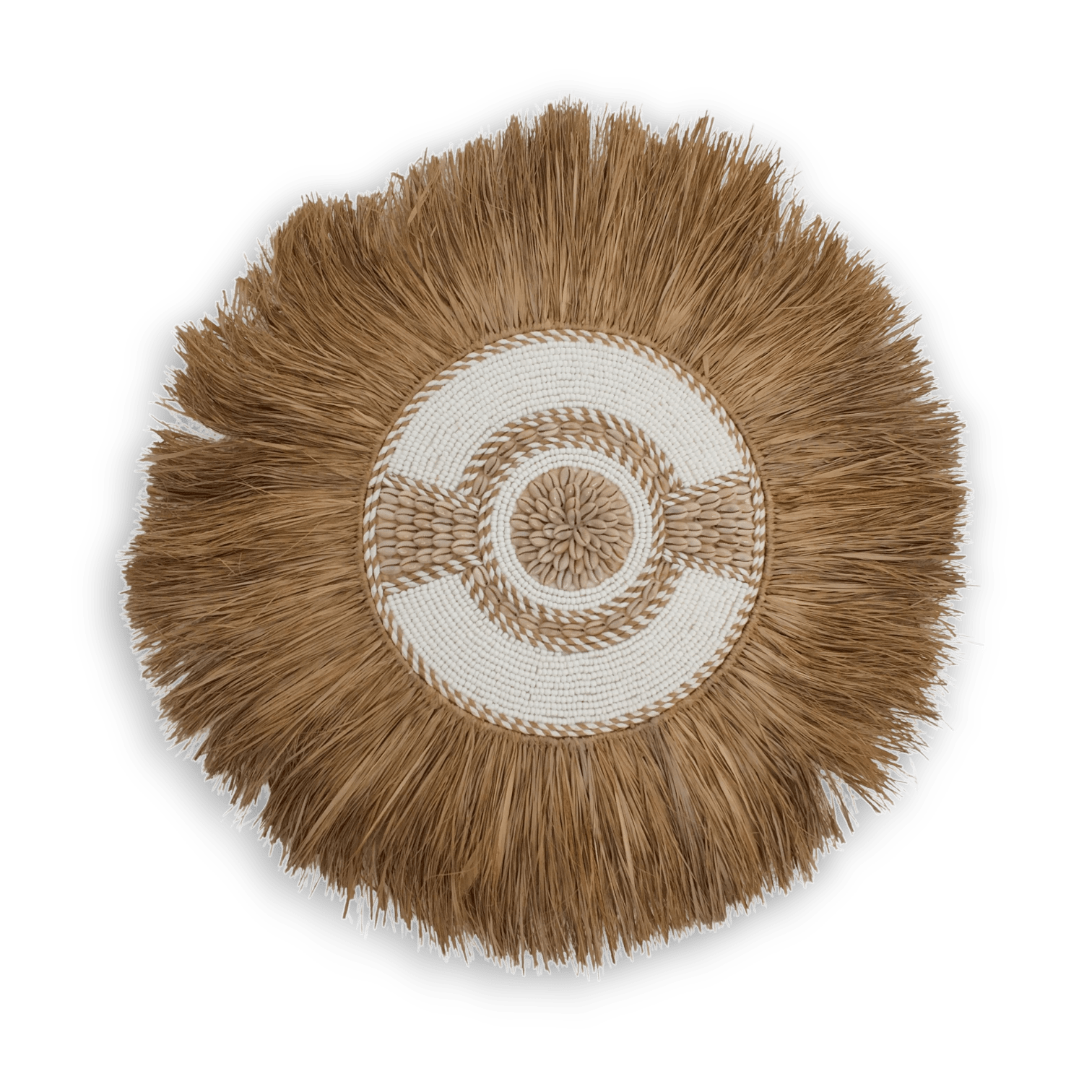 Geef je interieur een exotische uitstraling met deze witte variant Sagara. Deze ronde wanddecoratie is handgemaakt van natuurlijk zeegras en rijk versierd met groene kralen en gevlochten details. Het speelse contrast tussen de ruige vezels en het verfijnde patroon in het midden maakt dit stuk tot een echte eyecatcher. Perfect voor een bohemian, coastal of etnisch interieur – haal een stukje tropische sfeer in huis en laat je muren stralen.